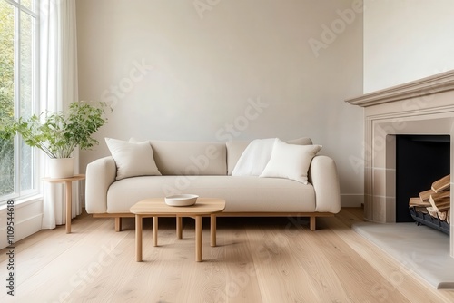 Modern Minimalist Living Room with Neutral Color Palette Featuring Comfortable Sofa and Wooden Furniture, Perfect for Cozy Interiors
