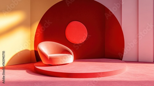 Modern Minimalist Red Chair in Colorful Interior with Geometric Shapes and Soft Lighting
