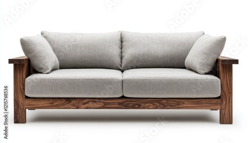 Modern minimalist sofa with light grey fabric upholstery and dark wood frame.