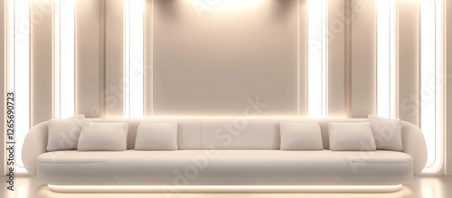 Modern minimalist white sofa in a futuristic room with warm lighting.