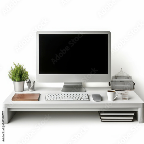 Modern Minimalist Workspace with a Large Computer Monitor, Potted Plants, and Clean White Desk Setup