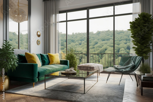 Modern minimalistic interior of the living room, green, white and golden colors. Super photo realistic background, generative ai illustration.