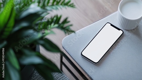 Modern Mobile Phone with Blank White Screen on Coffee Table with Green Plant - Technology at Home Concept