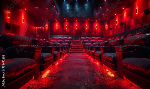 Modern Movie Theater with Red Neon Lighting and Comfortable Seating