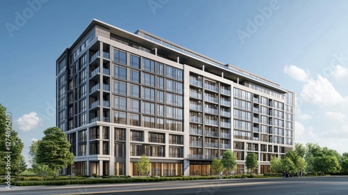 Modern multi-story building with large windows and balconies in a sunny urban setting.