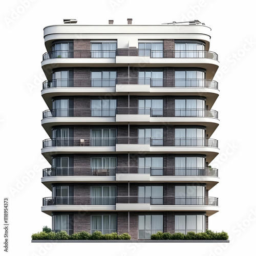 Modern multi-story residential building with balconies and large windows.
