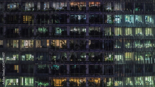 Modern office building with big windows at night timelapse, in windows light shines