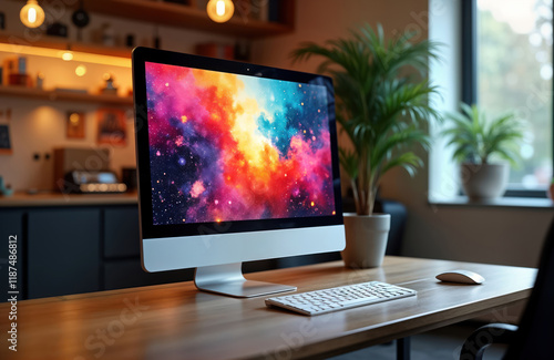Modern office desk mockup. Empty workplace with computer, peripherals. Colorful digital screen with nebula design. Wooden surface with keyboard, mouse. Potted plants, window. Interior design concept.