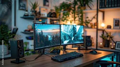 Modern Office Desk with Dual Monitors and Greenery, Softly Illuminated,