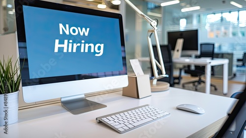 Modern Office Desk with "Now Hiring" Banner on Computer Screen, Minimalistic Supplies, Light Background