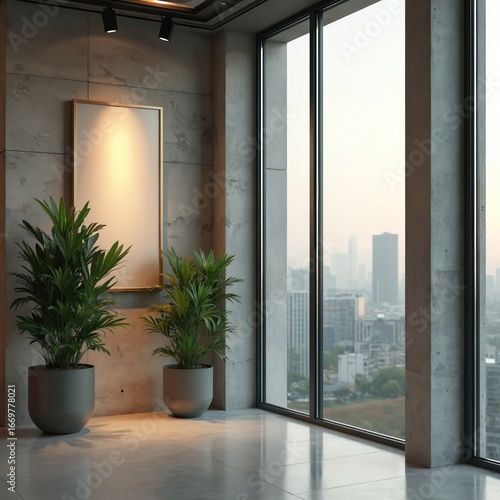 Modern office interior features concrete walls, polished grey floor, large windows with city views. Two potted palm plants add green plants. Blank vertical golden frame hangs on wall, illuminated by