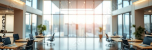Modern office interior with open space and large windows overlooking the city skyline at sunset