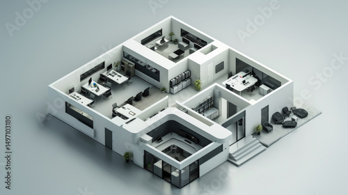 Modern office layout with collaborative spaces and design