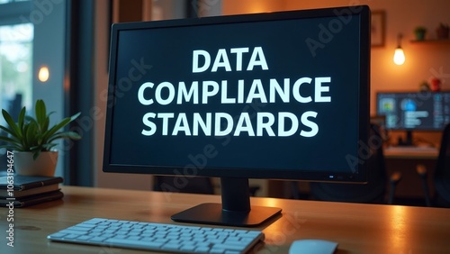 Modern Office Scene Featuring Data Compliance Standards on a Monitor