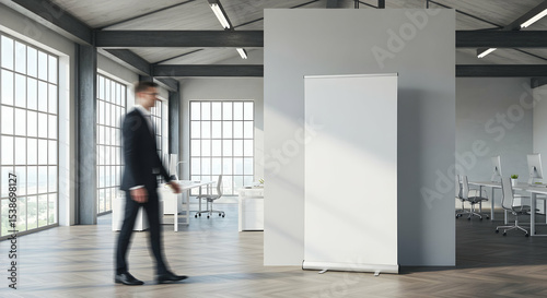 Modern Office Space Businessman Walking Blank Roll Up Banner Mockup Design Template
