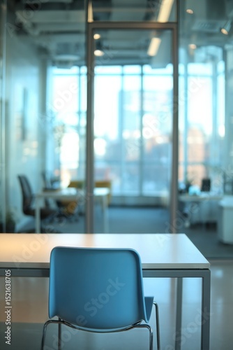 Modern Office Space With a Wooden Desk and Blue Chair in a Creative Workspace Setting.