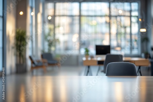 Modern office space with blurred background, featuring an empty desk in the foreground and chairs, computers, and plants in the background