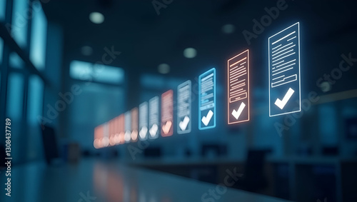 Modern Office with Floating Checkmarks for Digital Document Approvals