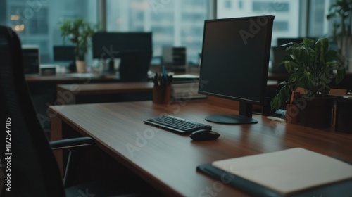 Modern office workspace featuring a desk, computer monitor, and minimalistic decor.