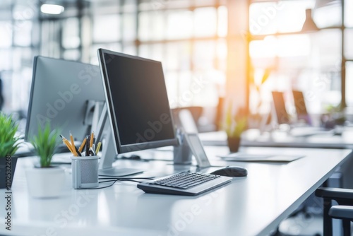 Modern Office Workspace with Computers and Green Plants, Bright and Spacious Environment, Focus on Minimalist Design and Productivity Enhancements