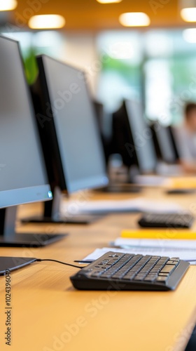 Modern office workspace with computers and keyboards, bright and organized environment.
