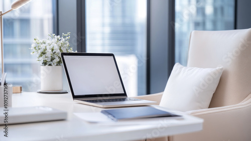 Modern Office Workspace with Laptop, Comfortable Chair, and Minimalist Decor, Showcasing a Professional Environment for Productivity and Creativity