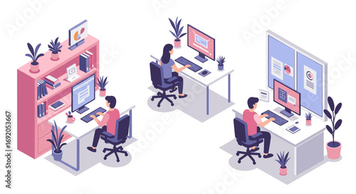 Modern office workspace with people working at desks in isometric design