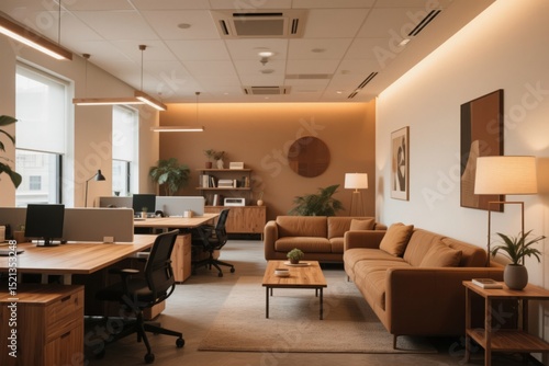 Modern office workspace with wooden desk and orange ergonomic chairs in warm interior design