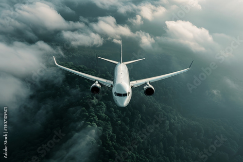 Modern passenger aircraft soaring through cloud-filled skies powered by innovative sustainable biofuel, demonstrating aviation industry commitment to environmental progress above verdant forests.