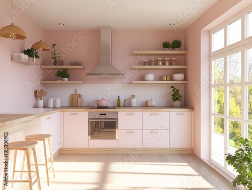 Modern Pink Kitchen With Wooden Accents And Natural Light