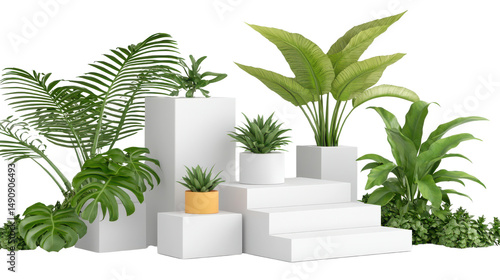 Modern Plant Display on Geometric White Steps with Lush Greenery and Vibrant Pots for Decoration