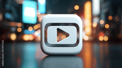 Modern play button icon with a blurred city backdrop, perfect for digital media projects.