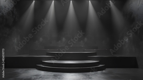 Modern podium background with sleek, minimalist design. Monochrome color scheme with soft spotlights illuminating the podium