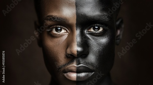 Modern portrait of man with black skin split into two color tone parts. Concept of beauty, cultural diversity, unity, and stop discrimination