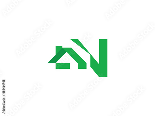 Modern real estate logo design featuring abstract house and roof shapes combined with bold letterforms. Created with clean geometric lines and a green color scheme, the design represents growth, n
