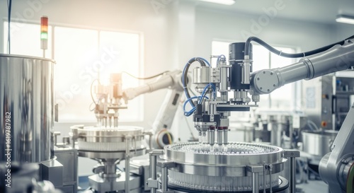 Modern robotic arms filling vials on a production line inside a pharmaceutical factory, showcasing automation and advanced technology in medicine manufacturing