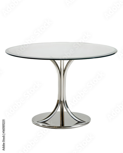 Modern round glass dining table with chrome base offers elegant design for dining and entertaining spaces