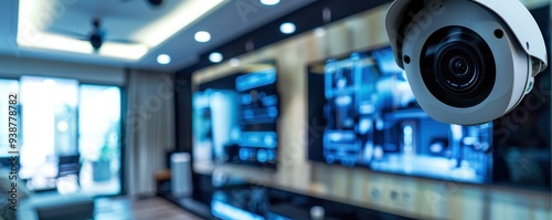 Modern security camera system monitoring a high-tech control room with multiple screens and equipment.