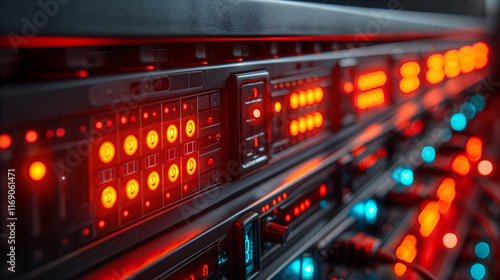 Modern server room filled with NAS devices, vibrant LED indicators in data center. Generative AI