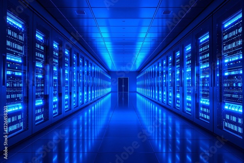 Modern server room with glowing blue lights, symmetrical placement of server racks, reflective floor, and futuristic ambiance. Ai generative