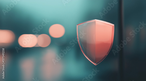 Modern shield icon displayed on reflective surface with soft bokeh background in urban setting during twilight Generative AI