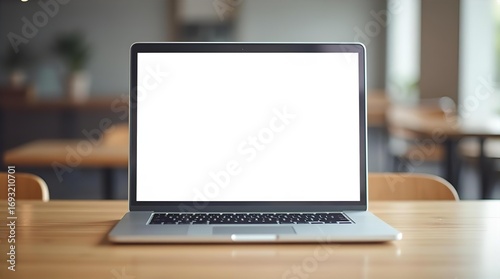 Modern silver laptop with a blank white screen on a light wooden table, set against a blurred professional office or cafe background for your mockups.
