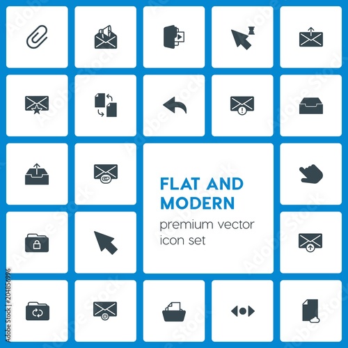 Modern Simple Set of folder, cursors, files, email Vector fill Icons. Contains such Icons as paperclip, send, internet, data, update, clip and more on dark background. Fully Editable. Pixel Perfect