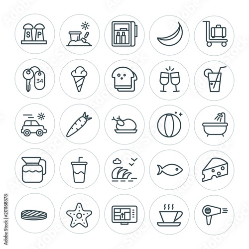 Modern Simple Set of food, hotel, drinks, travel Vector outline Icons. ..Contains such Icons as fridge, blow, bucket, room, summer, toy and more on white background. Fully Editable. Pixel Perfect