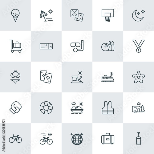 Modern Simple Set of sports, travel Vector outline Icons. ..Contains such Icons as luggage, safety, party, wheel, vest, life, sport and more on white background. Fully Editable. Pixel Perfect.