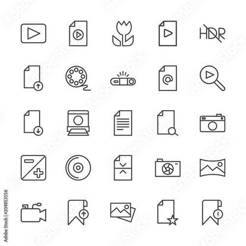 Modern Simple Set of video, photos, bookmarks, files Vector outline Icons. Contains such Icons as caption, microphone, photo, data, sky and more on white background. Fully Editable. Pixel Perfect.