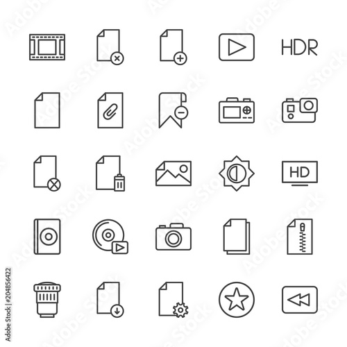 Modern Simple Set of video, photos, bookmarks, files Vector outline Icons. Contains such Icons as data, play, business, hdr, scroll, add and more on white background. Fully Editable. Pixel Perfect.