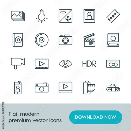 Modern Simple Set of video, photos Vector outline Icons. ..Contains such Icons as entertainment, hdr, design, travel, vintage, camera and more on white background. Fully Editable. Pixel Perfect.