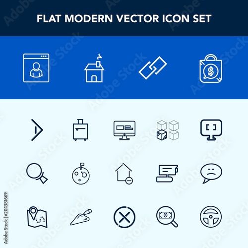 Modern, simple vector icon set with sale, medicine, apartment, house, laboratory, price, luggage, link, moon, technology, arrow, equipment, computer, hyperlink, cardboard, web, tool, home, bag icons