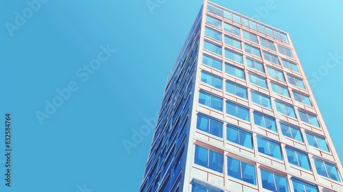 Modern skyscraper with numerous windows, set against a bright blue sky. Ideal for illustrating cityscapes and architecture